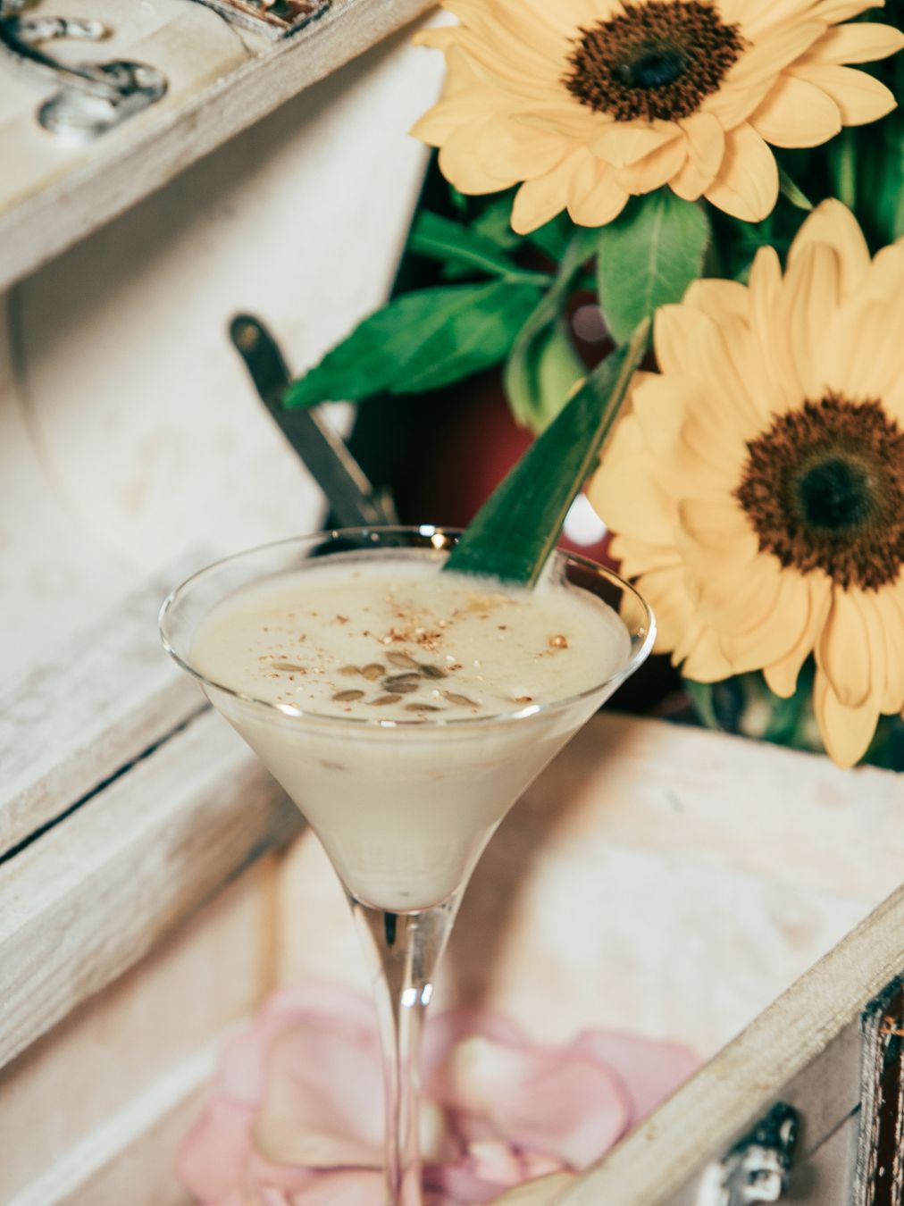 ピニャ・コラーダのひまわりEFPツイストをご用意致しました。有機ココナッツミルクを使用し、ショートカクテルとしてシャープに仕上げました。